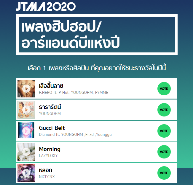 งานประกาศรางวัลทางดนตรี JOOX Thailand Music Awards ที่จัดโดย JOOX มิวสิคแอปพลิเคชัน เวียนมาอีกครั้งในปีนี้ ซึ่งล่าสุดเปิดให้มีการโหวตผลงานและศิลปินที่แฟนเพลงชื่นชอบตั้งแต่วันที่ 13 ก.พ. ถึง 8 มี.ค. โดยมีศิลปินชื่อดังเข้าชิงกันมากมาย และสำหรับสายฮิปฮอปนำโดย F.HERO และ YOUNGOHM ที่เข้าชิงใน รางวัล เพลงและศิลปินแห่งปีด้วยกันทั้งคู่