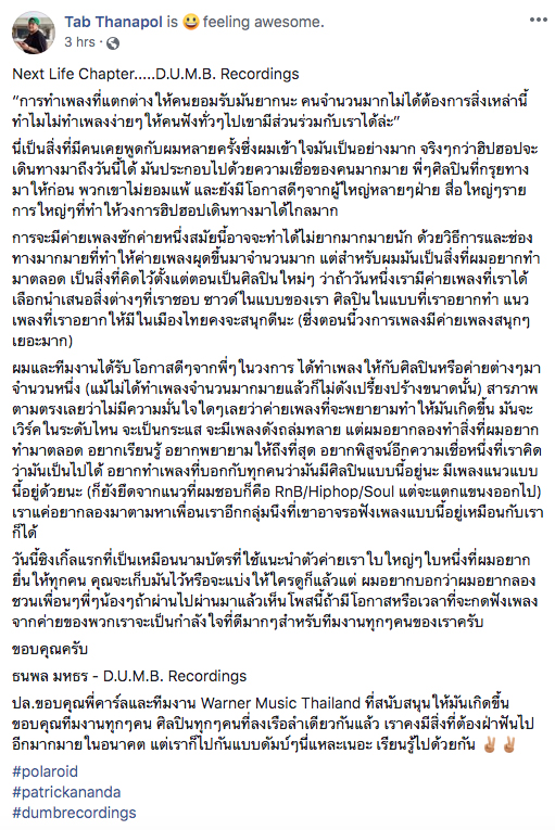 โดยแต๊บ ได้โพสต์เล่าถึงเส้นทางการเกิดขึ้นของค่าย D.U.M.B. ไว้ในเฟซบุ๊คส่วนตัวว่า การทำค่ายนี้เป็นการพยายามจะบอกกับทุกคนว่ามันมีศิลปินแบบนี้อยู่ เป็นแนวที่เขาชื่นชอบก็คือ RnB/Hiphop/Soul แต่จะแตกแขนงออกไปอีก เราแค่อยากลองมาตามหาเพื่อนเราอีกกลุ่มนึงที่เขาอาจรอฟังเพลงแบบนี้อยู่เหมือนกับเรา