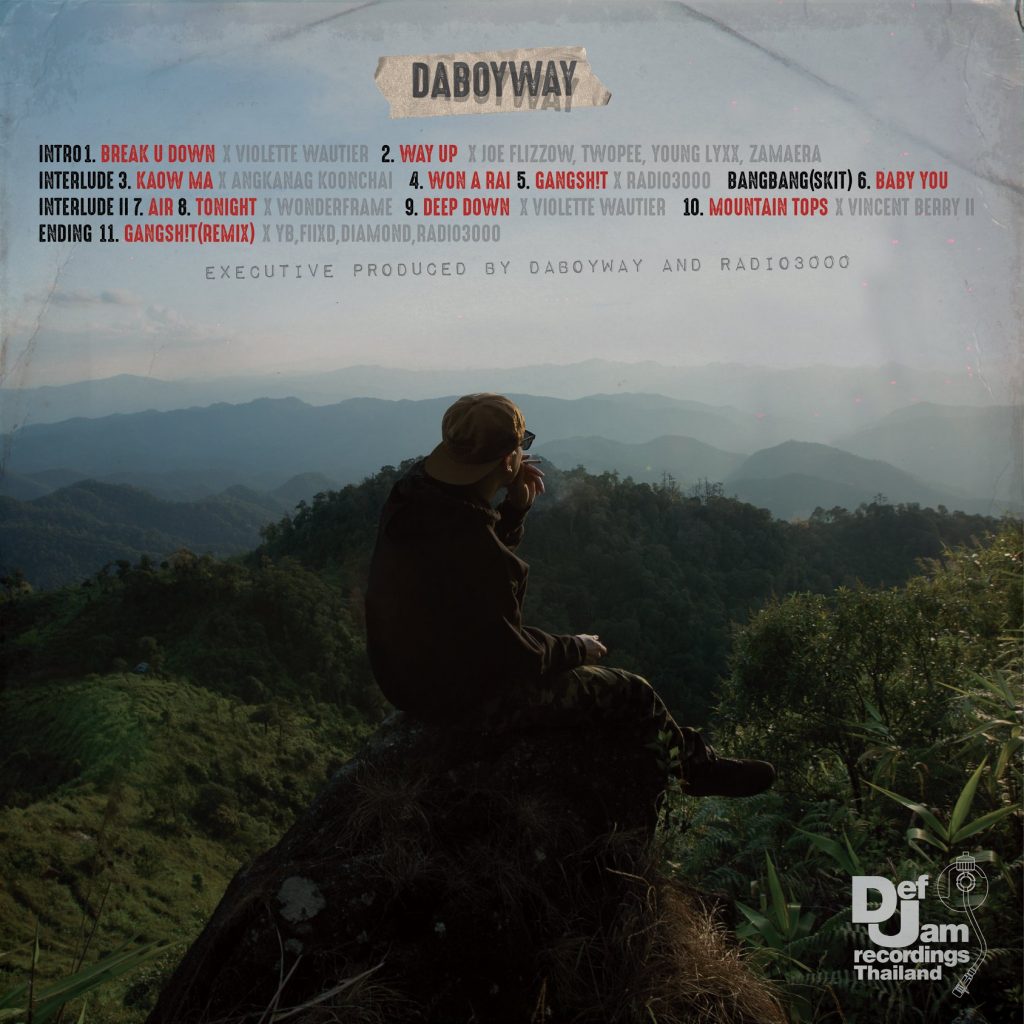 DABOYWAY หรือ เวย์ – ปริญญา อินทชัย แร็พเปอร์แนวหน้า เจ้าพ่อฮิปฮอปของประเทศไทย ได้ปล่อยอัลบั้มเดี่ยวที่ชื่อเดียวกับชื่อตัวเองว่าอัลบั้ม DABOYWAY ในวันที่ 6 มี.ค. ภายใต้สังกัดใหม่ “Def Jam Recordings South East Asia” ที่พร้อมผลักดันศิลปินฮิปฮอปจากไทยเข้าสู่สากล ซึ่งอัลบั้มนี้ก็เป็นผลงานชูโรงชิ้นแรกที่รวบรวมเป้าหมายและสื่อสารถึงจุดหมายของศิลปินได้อย่างชัดเจน ถึงตรงนี้เราก็ไปเข้าสู่การรีวิวอัลบั้มนี้อย่างเจาะลึกกันเลย